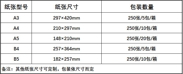 產品包裝:250張/包,10包/箱(A4包裝,其他包裝依據尺寸而定)