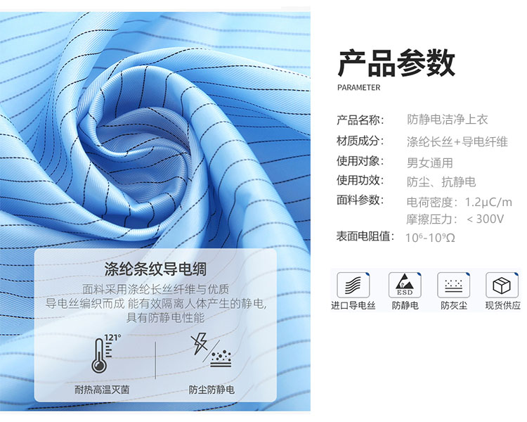防靜電夾克上衣是由專業的防靜電面料制作,采用滌綸長絲與高性能導電纖維編織而成,具有高效、永久的防靜電、防塵性能,能有效釋放人體靜電荷,從而滿足高級別無塵環境的要求。廣泛應用于電子電器、食品、生物制藥、實驗室等無塵車間及產線。