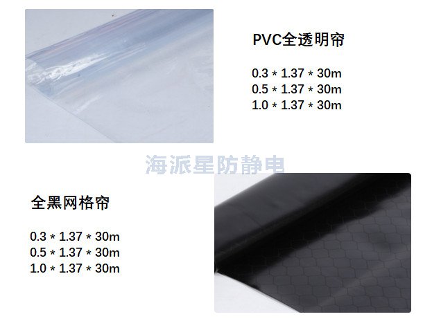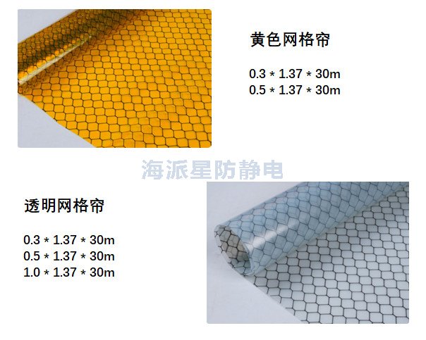 防靜電款式:PVC全透明簾、防靜電透明網(wǎng)格簾、全黑防靜電網(wǎng)格簾、黃色防靜電網(wǎng)格簾。