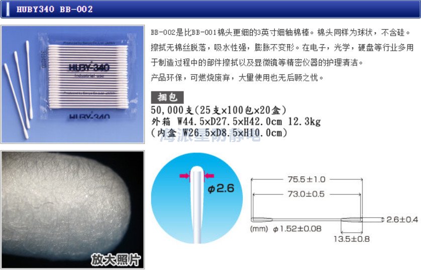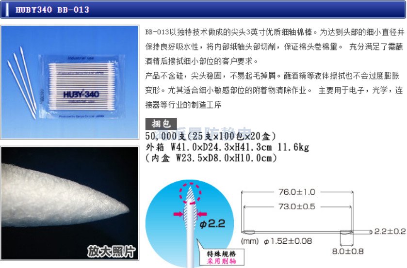 | 日本HUBY | BB-001 | 3寸 | 25只/包,100包/盒,20盒/箱 | 3"雙頭棉簽、圓頭,白色紙桿 |