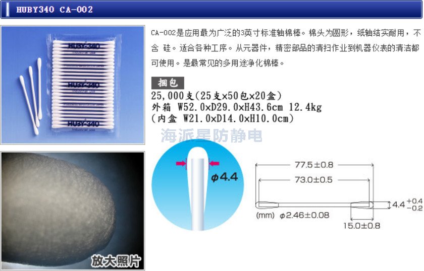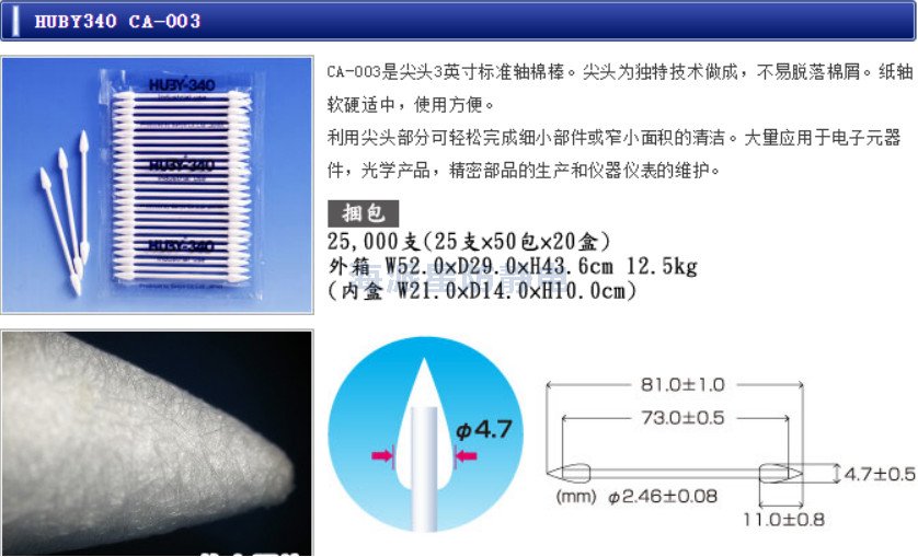 | 日本HUBY | CA-003 | 3寸 | 25只/包,50包/盒,20盒/箱 | 3"雙頭棉簽、錐形尖頭,白色紙桿 |