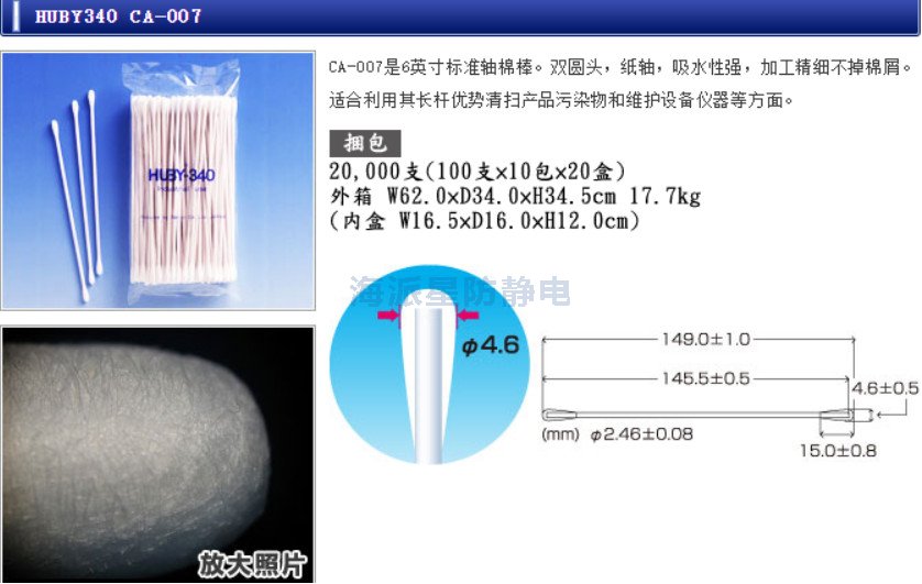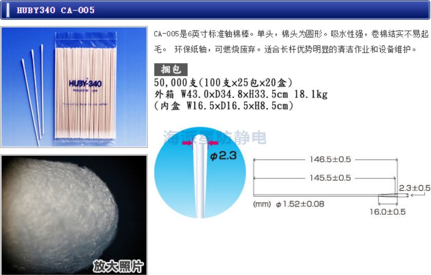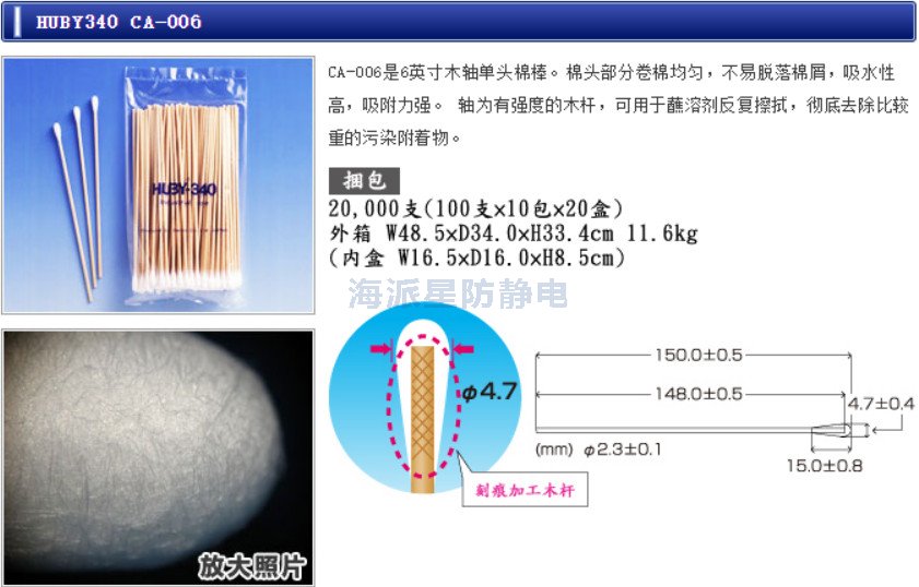 | 日本HUBY | CA-006 | 6寸 | 100只/包,10包/盒,40盒/箱 | 6"單頭棉簽、圓頭,白色木桿 |